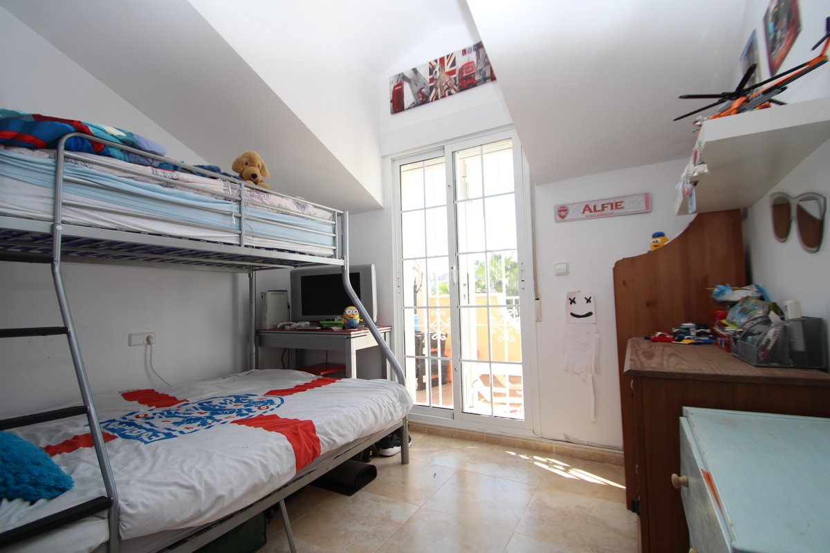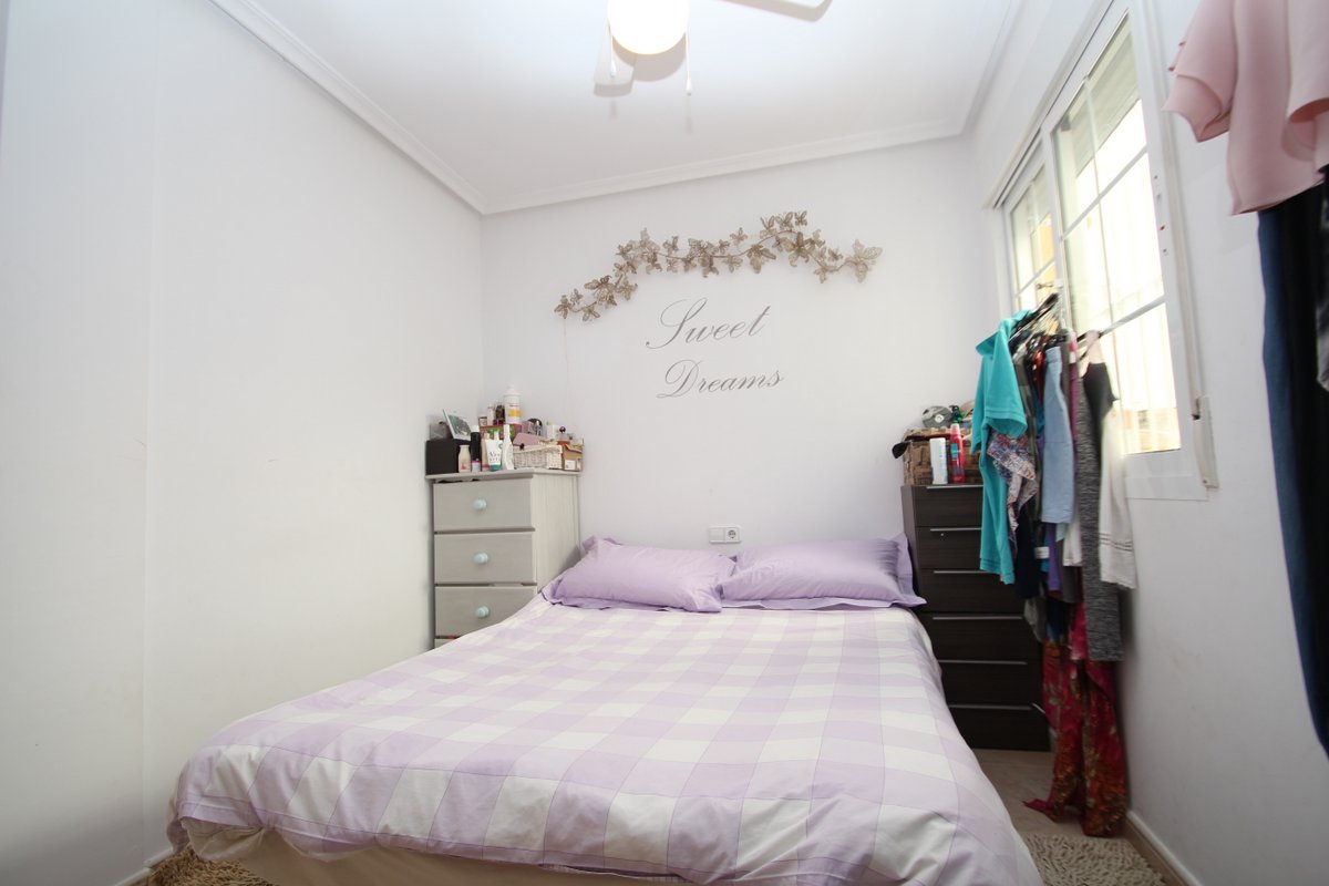 Lomas de Cabo Roig, South facing townhouse within a completely closed urbanization in front of the pool with jacuzi and very sunny community garden. The house is distributed over 2 floors of 85 m2 with 3 bedrooms and 2 bathrooms. On the ground floor is a large paved garden of 60 m2, the living room with fireplace, 1 bedroom, bathroom, kitchen and gallery. On the 1st floor there are 2 bedrooms with exit to the solarium of about 24 meters and 1 bathroom. The house is furnished with air conditioning.