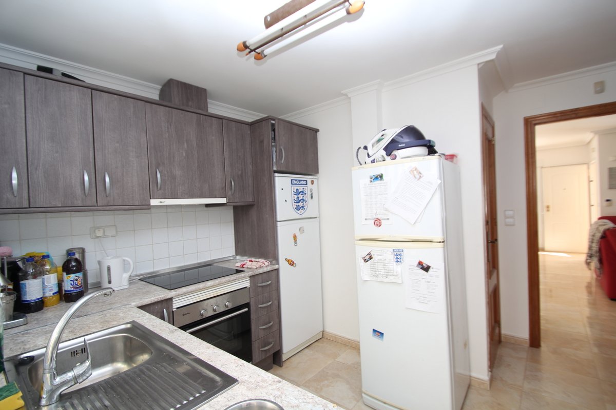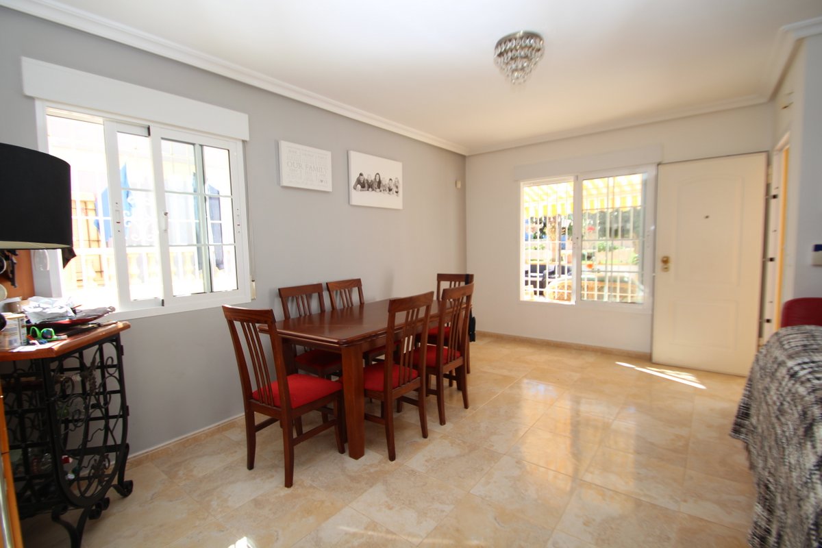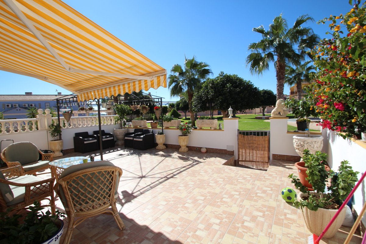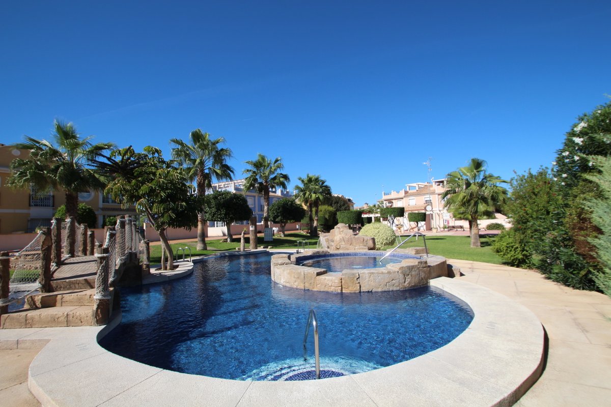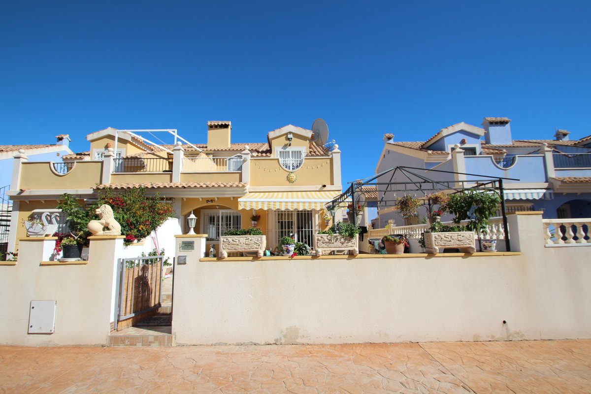 Lomas de Cabo Roig, Adosado dentro de una urbanización completamente cerrada frente a la piscina con jacuzi y jardín comunitario muy soleada con orientación Sur. La vivienda se distribuye en 2 plantas de 85 mts2 con 3 dormitorios y 2 baños. En la planta baja está un gran jardín enlosado de 60 mts2 el salón-comedor con chimenea,1 dormitorio, baño, cocina independiente y galería. En la planta 1ª hay 2 dormitorios con salida al solarium de unos 24 mts y 1 baño. La vivienda se encuentra amueblada con aire acondicionado.